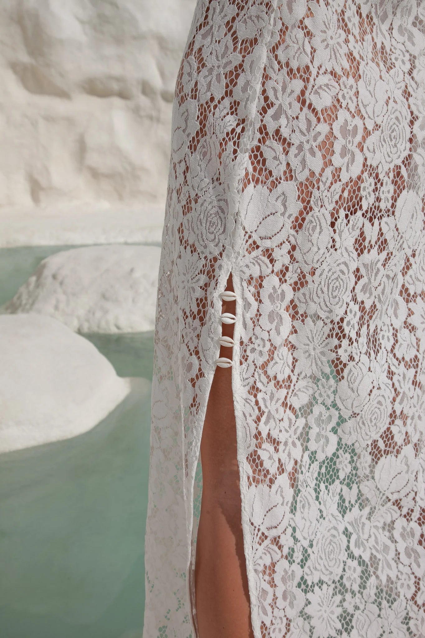 Made from delicate white floral lace, this maxi features flattering side splits adorned with natural cowrie shells for a touch of beach babe.
